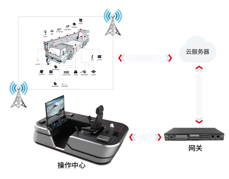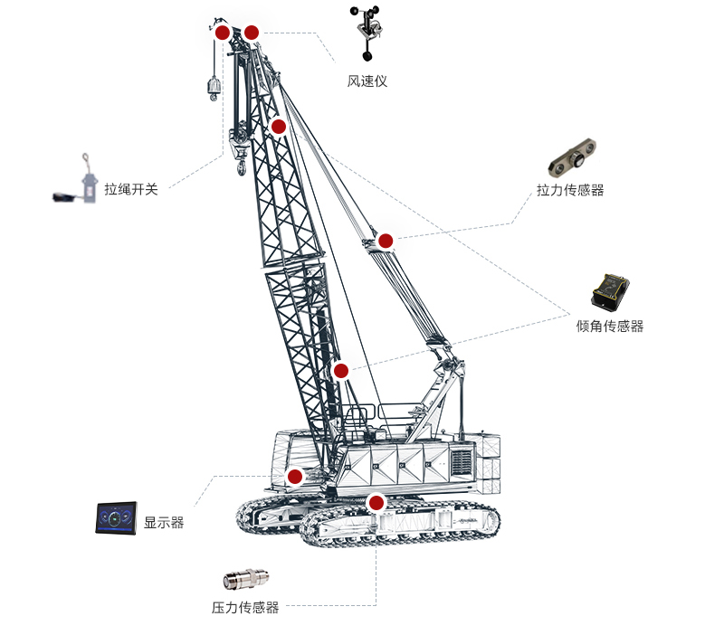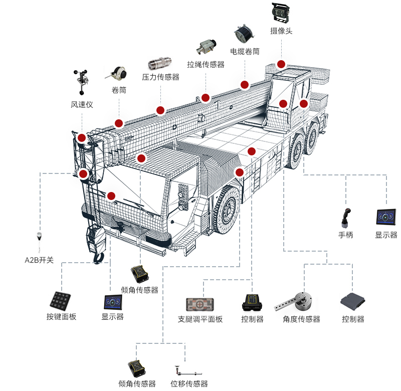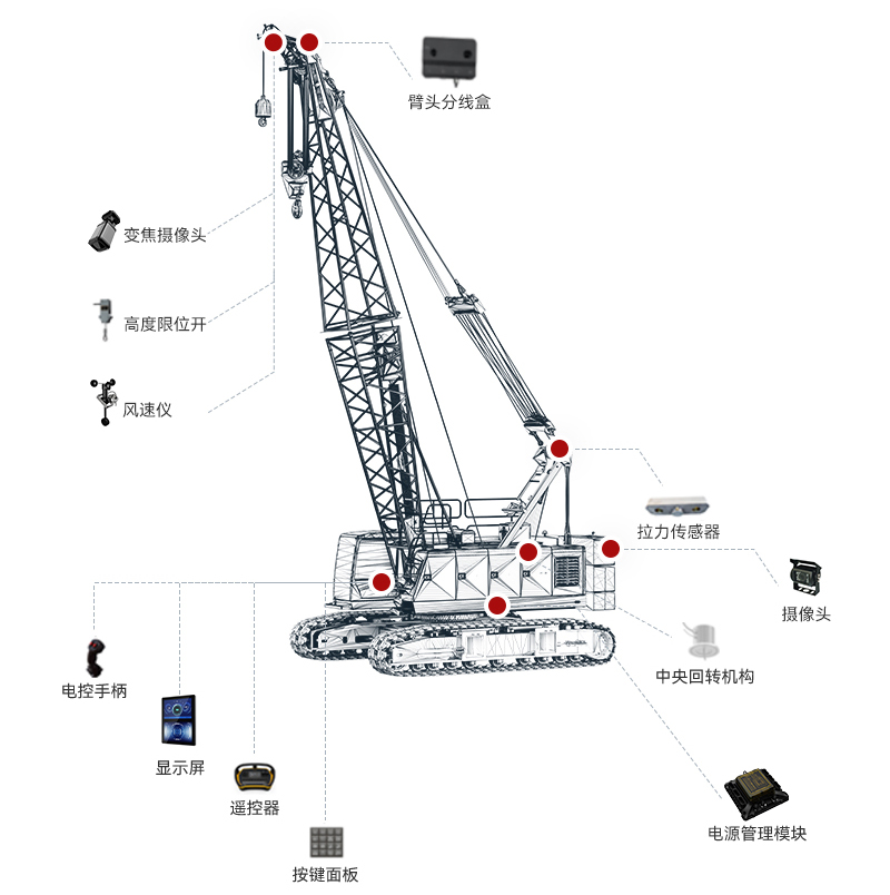 支持轉(zhuǎn)臺(tái)回轉(zhuǎn)控制、高度限位控制、變幅和卷揚(yáng)控制。